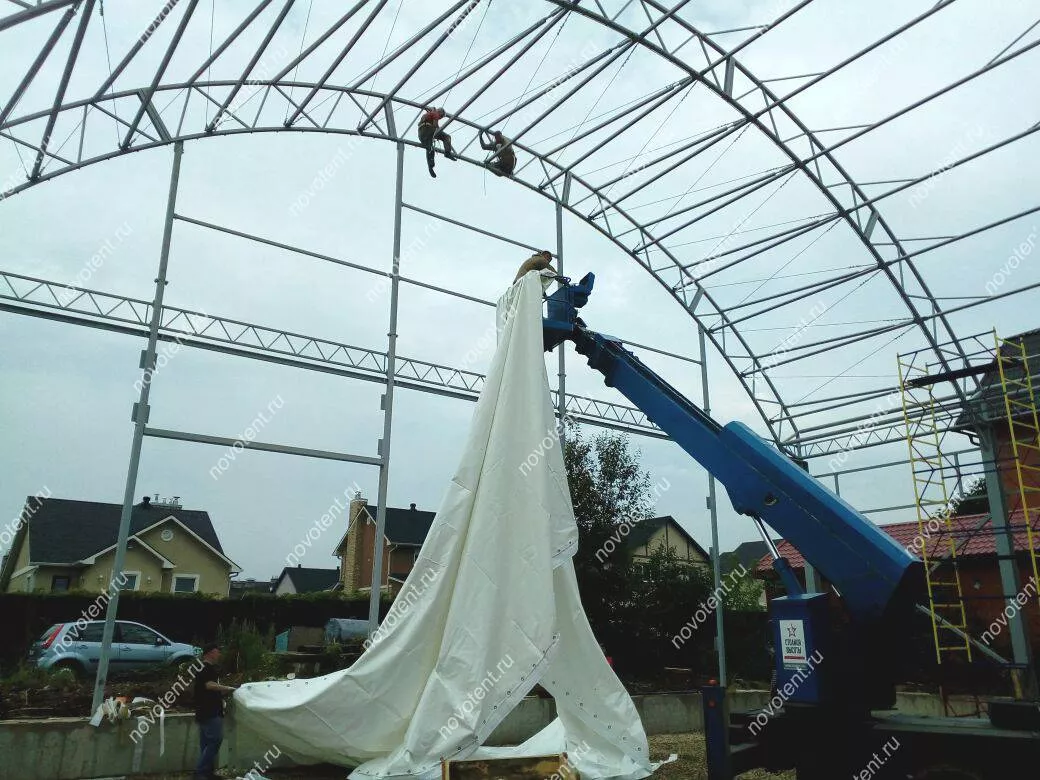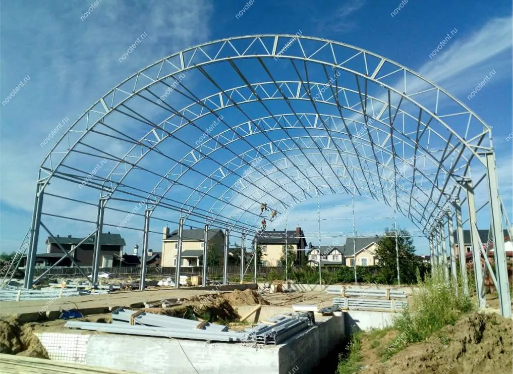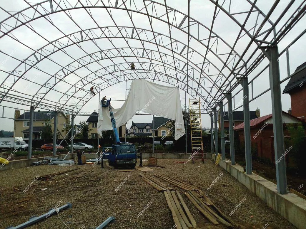 Продолжается монтаж каркасно-тентовой конструкции в Московской области. В данном сооружении будет расположен Центр пляжных видов спорта. Подобные конструкции не требуют подготовки массивного фундамента – она была установлена на ленточный фундамент. Размеры ангара: длина – 43 м, ширина – 21 м, высота боковых стен – 6,5 м, в коньке – 12 м.