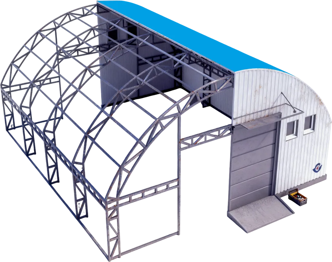 - Широкие пролеты. Кровля ангара перекрывает пространство шириной до 60 м без промежуточных опор, что позволяет технике беспрепятственно осуществлять маневры и разворачиваться внутри при разгрузке и загрузке.