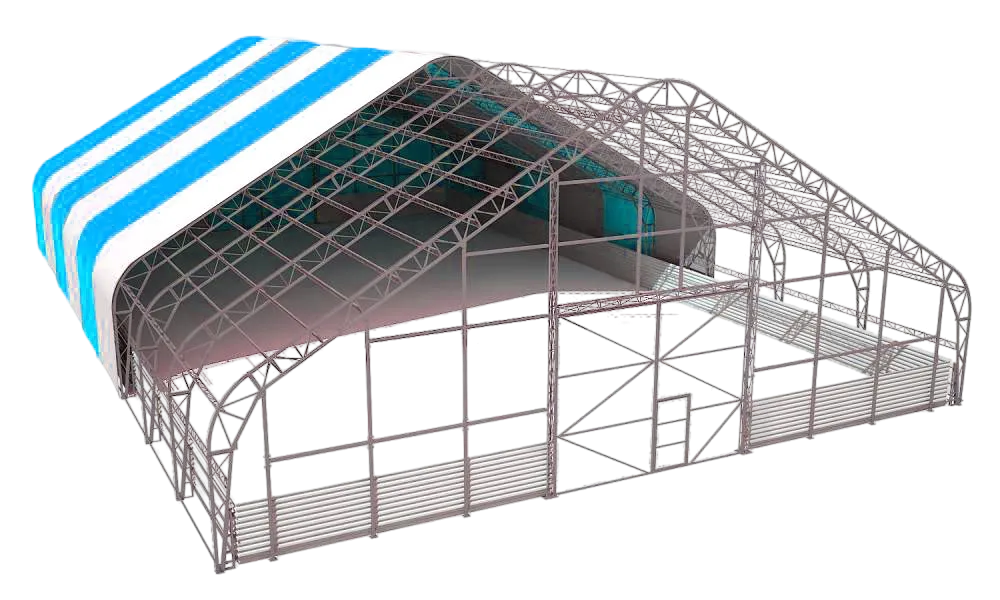 Для обтягивания каркаса используется чрезвычайно прочный и надежный тент, на изготовление которого идет специальное полотно из синтетического текстиля. Водонепроницаемое ПВХ покрытие защищает от неблагоприятных погодных факторов, обработка фунгицидами препятствует развитию плесени. Благодаря лакировке тента снег соскальзывает с кровли под собственным весом. Тентовая оболочка пропускает до 85% солнечного света, поэтому днем на складе можно работать без искусственного освещения.